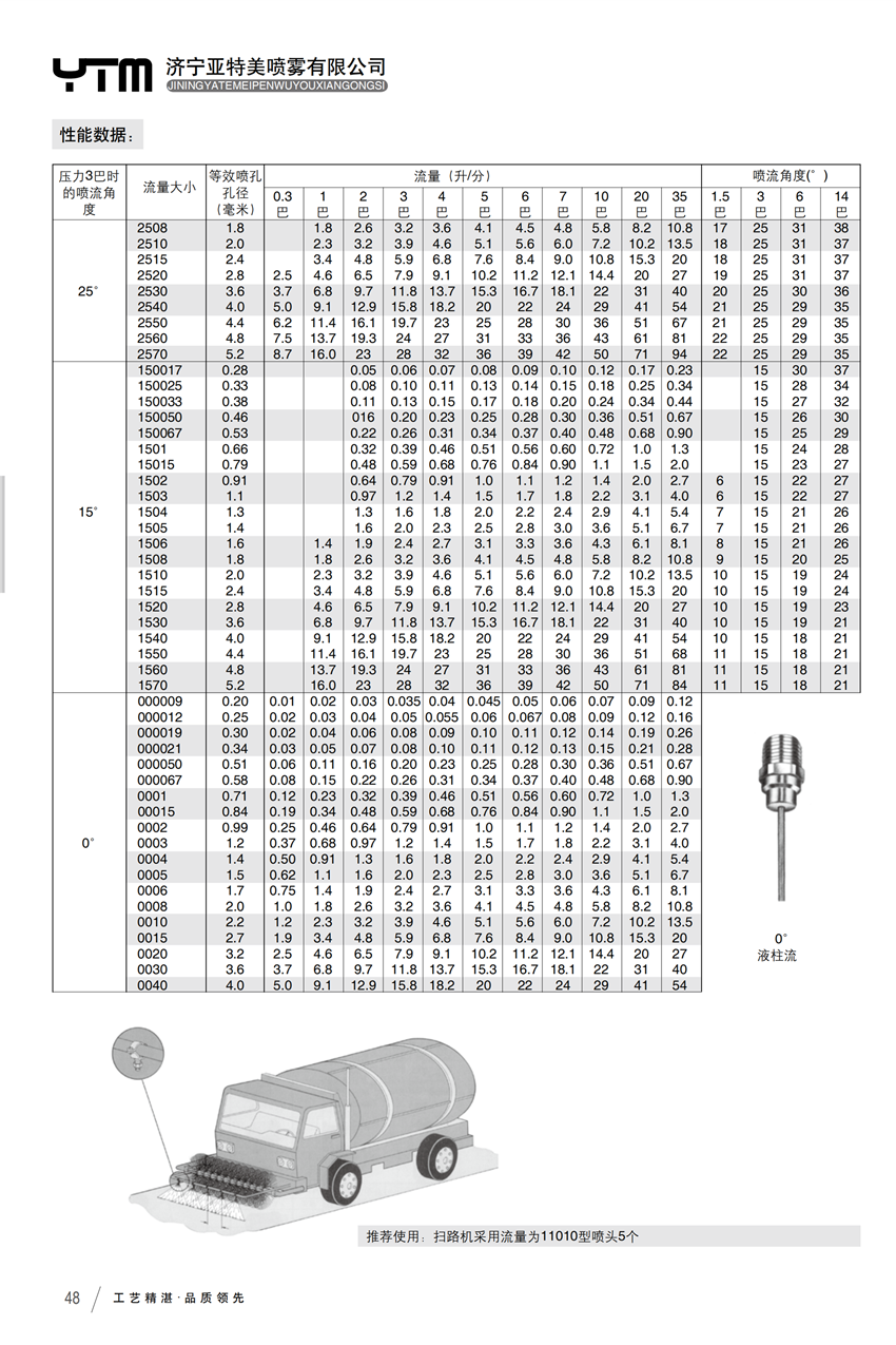 YTS型扇形喷射喷头能提供高冲击力的液柱流或扇形喷雾。喷射角在0°到110°之间。该喷头产生的喷雾分布均匀,液滴粗细小到中等。当需要几个喷嘴重叠喷射时.特殊设计的逐渐变尖的边缘使得喷射所覆盖的区域分布均匀。